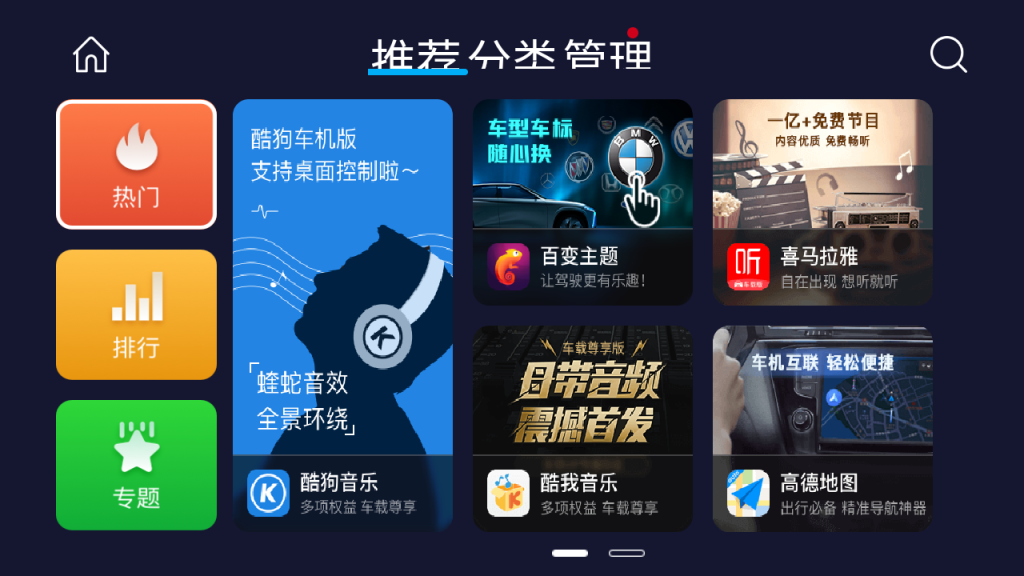 车必装市场车机版app下载最新版2023是一款非常好用的车载应用下载软件。里面汇集了海量的车载应用,可以方便汽车用户在车机上安装各种应用,改善和提升汽车用户的体验。该软件可以提供大量的车载应用,涵盖娱乐、资讯、安全等领域,满足汽车用户的多种需求,为汽车用户提供便捷的车载应用服务。此外,车必装市场车机版还提供了一键更新、一键卸载等便捷功能,能够让汽车用户更轻松地管理车载应用。