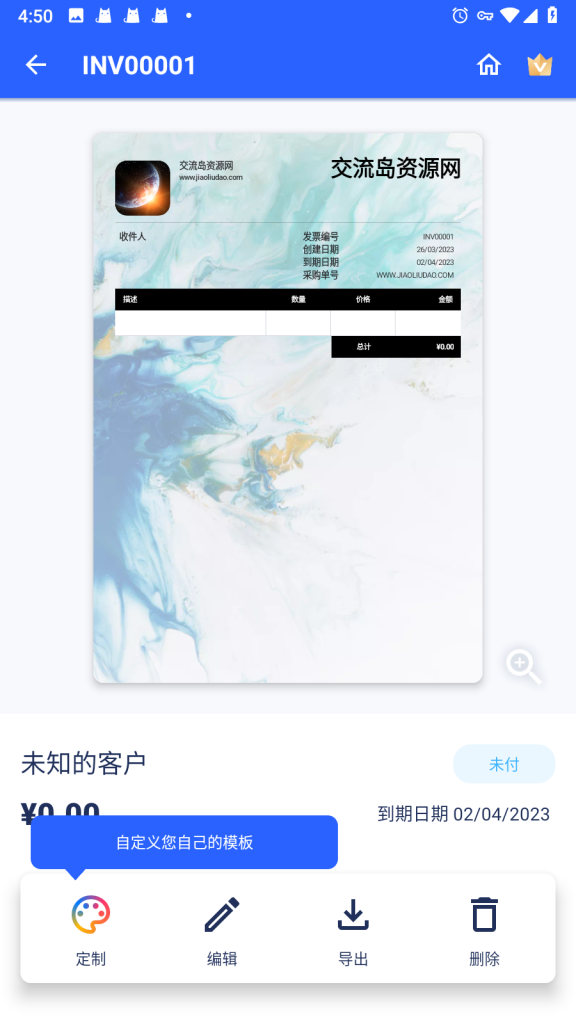支持上传公司logo,填写网站和各种条款来自定义只属于你的估价单和发票