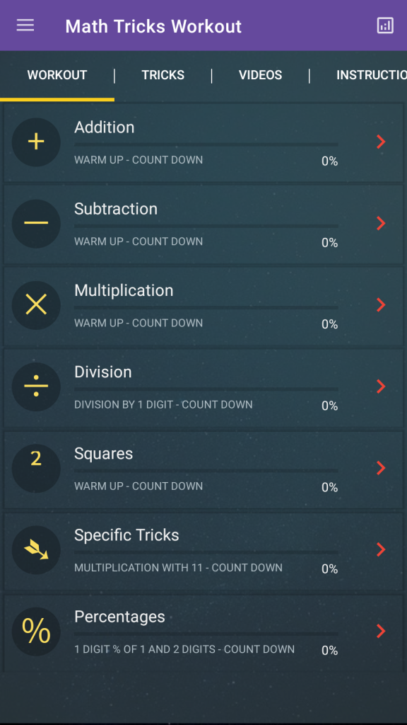 Math Tricks Workout 是最好的数学技巧应用程序之一,它为您提供最有趣的练习和练习,以测试和提高您的数学技能。灵感来自吠陀数学,它是有史以来最好的免费和酷的数学学习应用!我们棘手的数学应用程序将让您掌握数学并学习许多数学技巧,以一种非常简单、有趣和惊人的方式提高您的计算能力,同时浏览最具有挑战性的数学学习应用程序。