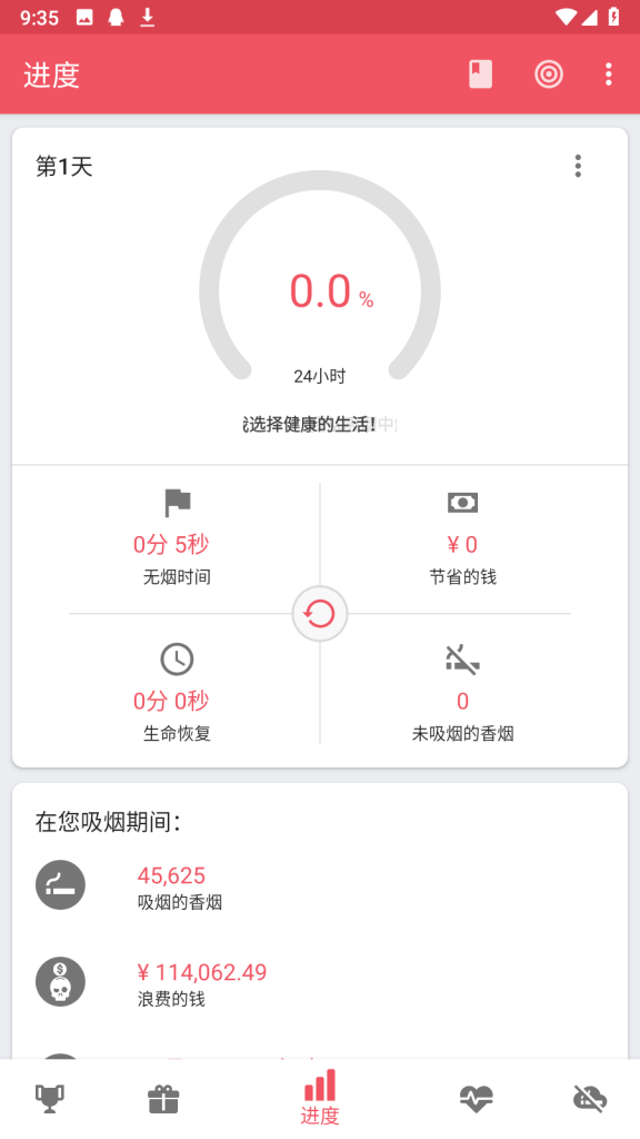 戒烟追踪器「Quit Tracker: Stop Smoking Premium」还可以让您了解您不吸烟的时间,以及您通过不吸烟恢复的寿命。您还可以查看您在戒烟之前失去了多少生命以及您吸了多少支香烟,而且您还可以查看如果您也戒烟,您可以获得什么类型的奖励。对于那些现在想改掉这个坏*惯但发现很难做到的人来说,这是一个完美的激励工具。这里的一个重要动力是“健康”选项卡,您可以在其中看到戒烟对您身体的积极影响。*得庆幸的是,您还可以跟踪进度并了解距离戒烟还有多远。