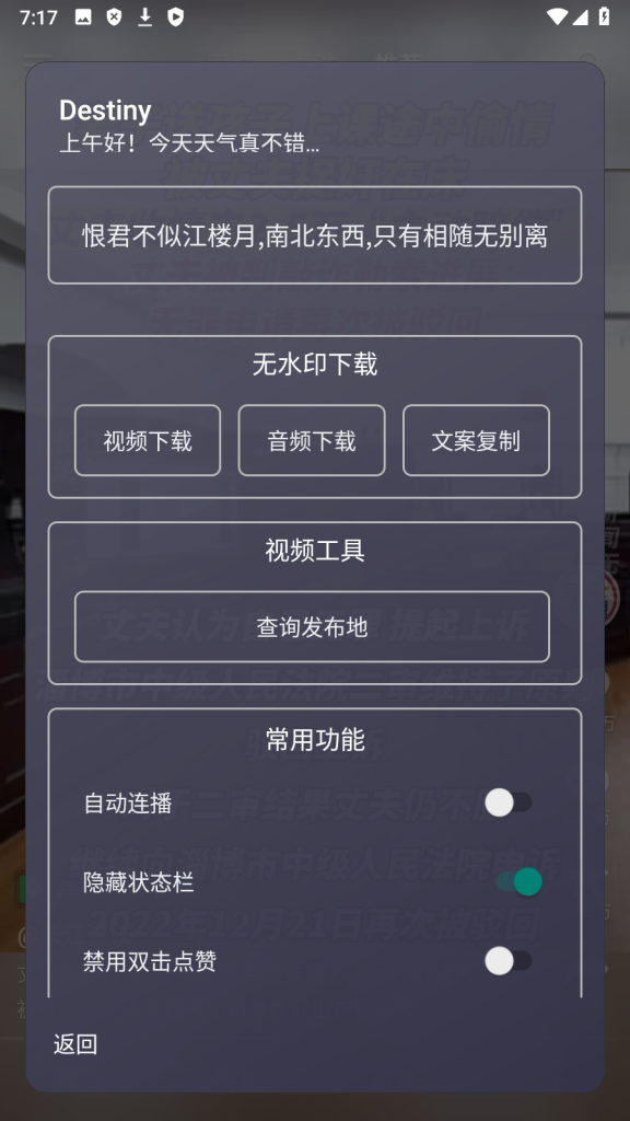 常用功能(自动连播,防烧屏,隐藏状态栏,禁用双击点赞,返回刷新