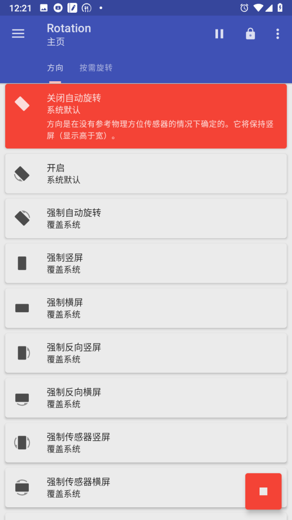 9.强行自动:强行自动旋转屏幕方式,但会覆盖应用程序设置
