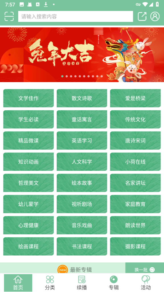 5、它的资源是非常的多,稍微数了一下大概有24个分类:文学佳作、诗歌散文、学生必读、童话语言、唐诗宋词、精品微课、绘本故事、摄影课程等等