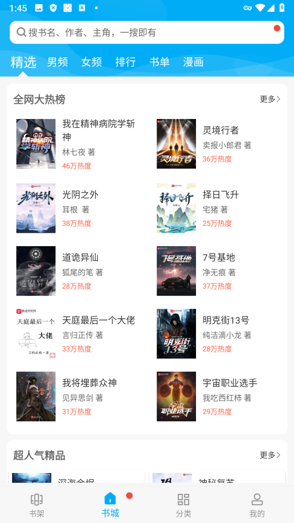 2、精选书单,从此不再书荒,强大的搜索功能很实用好用。