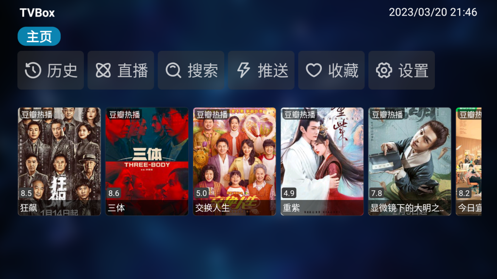 3、至于首页的热播为何会有影视剧?其实是TVBox采集的豆瓣热播排行,如果你对首页不满意,可以在设置里的「首页推荐」更改。