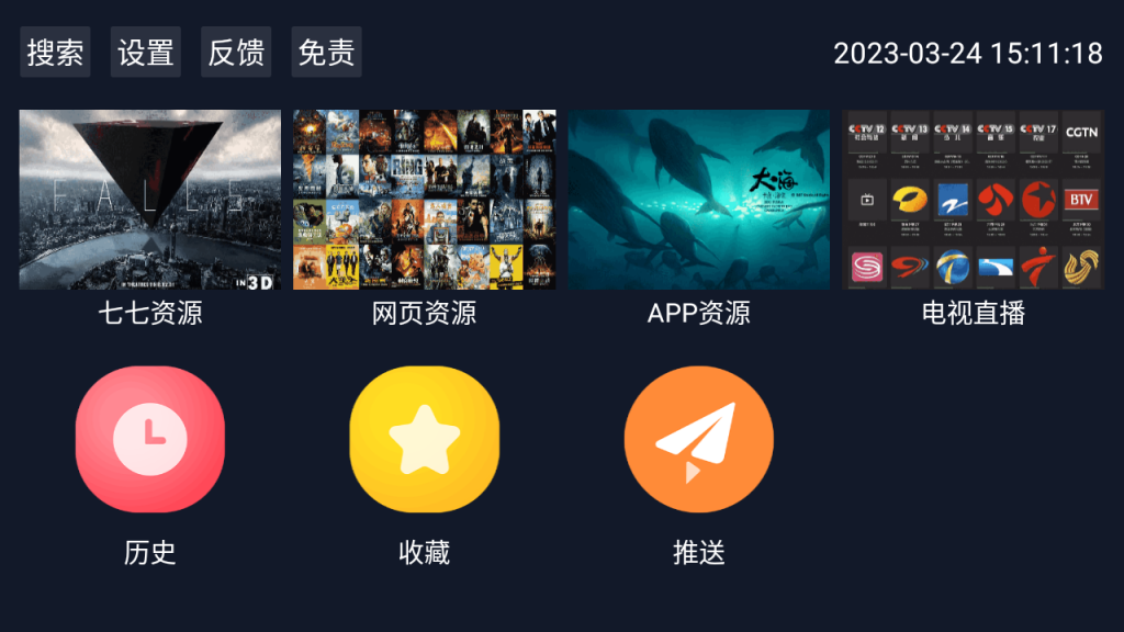 3、导入资源接口之后就可以看到软件主页界面已经有了内容,这些分类都是自己可以随意修改的。主要就是七七资源、网页资源、app资源、电视直播、历史记录、收藏和推送。