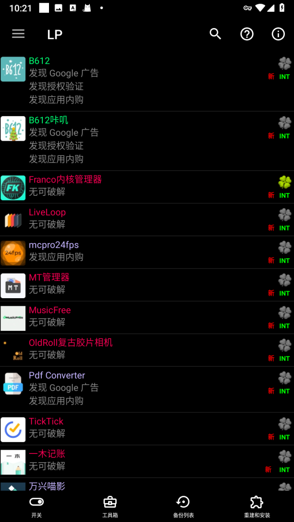 Lucky Patcher 显示不同的颜色口音以了解应用程序的状态。