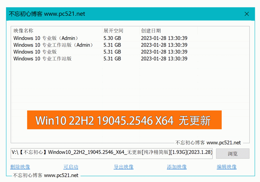 文件名: V:\【不忘初心】Window10_22H2_19045.2546_X64_无更新[纯净精简版][1.93G](2023.1.28).iso