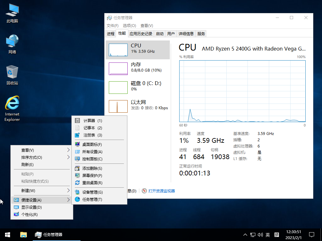 User安装完毕 C盘占用5.0G左右 首次进入桌面进程优化控制在40左右浮动