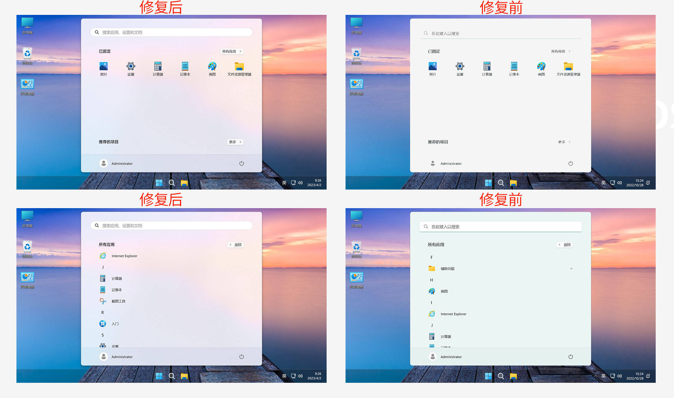 • 2023.4.2 修复开始菜单模糊透明效果,之前是任务栏白色字体和开始菜单模糊透明效果不能共存,现在可以共存了【查看对比图】