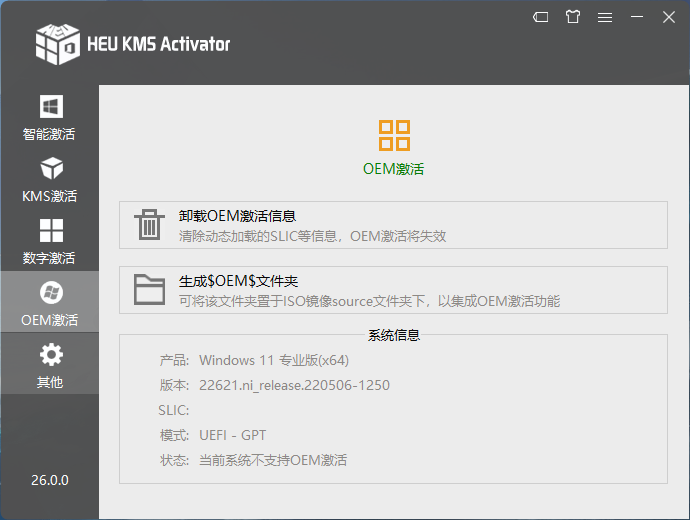 • 卸载OEM激活信息:清除动态加载SLIC等信息,OEM激活将失效