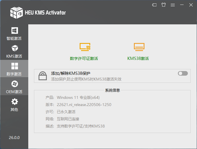 • 查看当前系统信息:网络状态/激活状态,描述是否支持数字许可证/KMS38