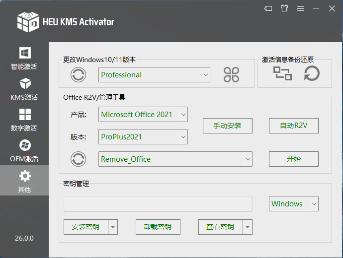 HEU KMS Activator 是一位叫知彼而知己大神开发的KMS激活最新版本添加了工具OEM激活,增加对Vista/Win7/Server 2008 (R2)/2012 (R2) OEM永久激活(支持)Legacy/UEFI BIOS),该工具可以完美激活Windows以及Office的VL版本可以一键激活,无需联网。目前最新版本HEU KMS Activator 新增Win激活10数字许可证不是以前的那个KMS激活后,许多系统可以使用数字权利永久激活,该工具可以用静默激活参数进行包装,并在包装系统安装后调用HEU KMS Activator 计划任务 此外,静默激活参数可完美激活,本版激活成功率最高,推荐系统封装爱好者使用,易破姐收集整理了100%来自知彼知己的正版激活工具,无广告、无流氓行为、无捆绑、无后门。