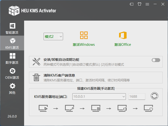 • 搭建KMS服务器[手动激活]:KMS服务器地址/端口