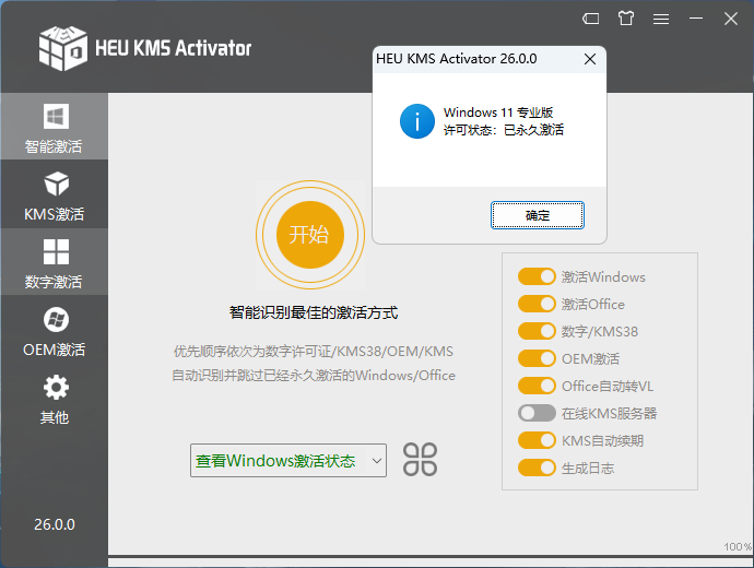 11.如果打开在线KMS智能激活时不安装自动续期服务器。