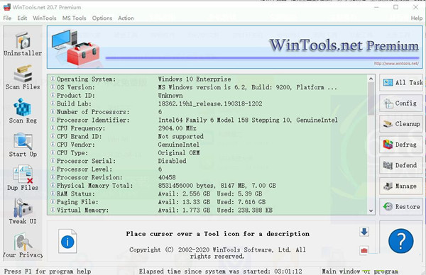 WinTools.net Professional 包括工具:Clean Uninstaller(卸载器)、Scan Files(文件扫描器), Scan Registry(注册表扫描器), Start Up(启动管理), Tweak UI(系统设置), Net Tweaker(网络设置), The Privacy(隐私策略)…