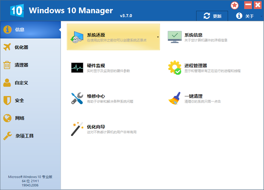 - 集成右键 快捷设置 包含 注册表 组策略 计算器 桌面图标 控制面板 系统服务 重启桌面 系统版本。